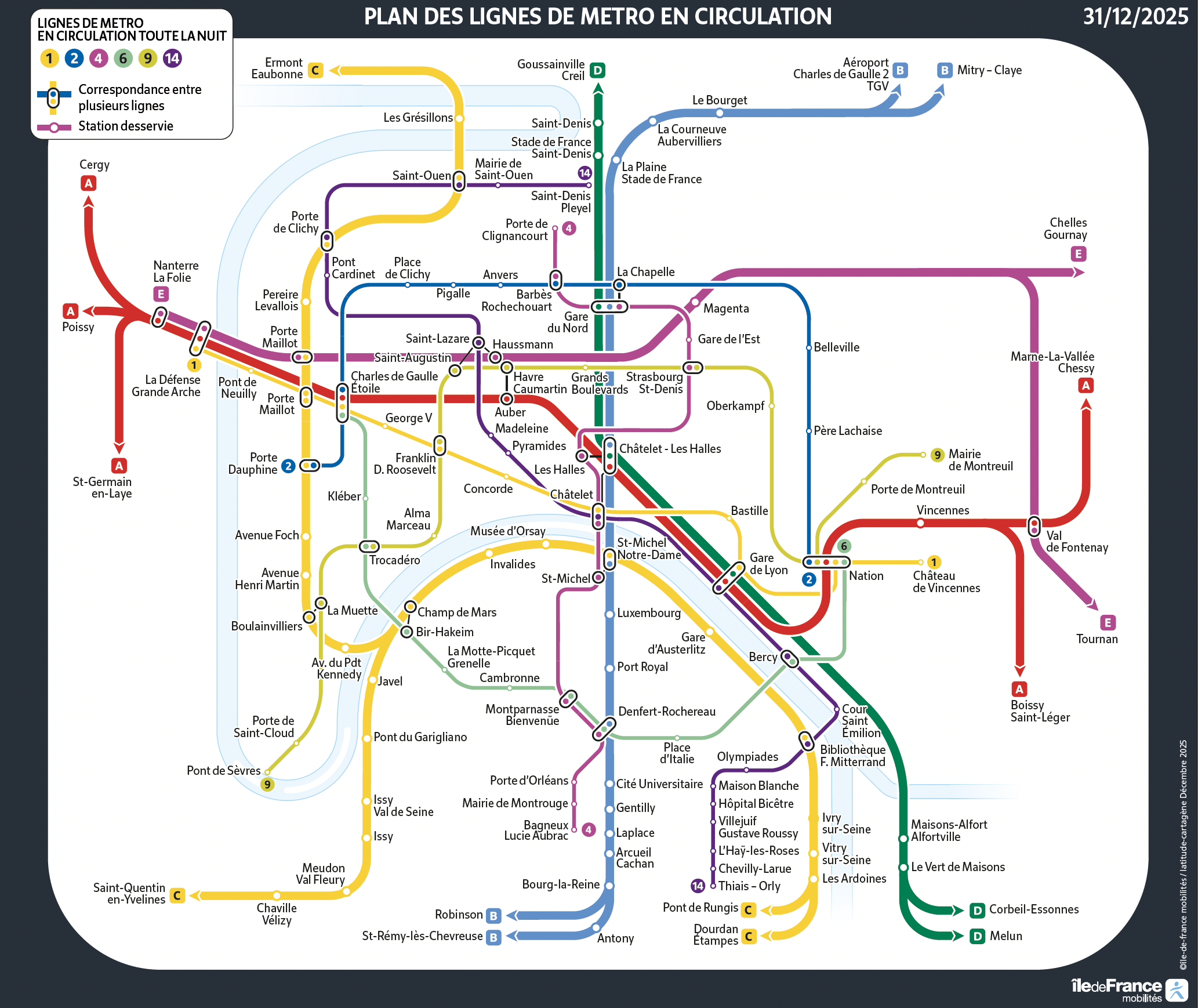 Come avviene ormai da anni, durante la notte di san Silvestro alcune linee della metropolitana e del RER rimarranno in funzione per tutta la notte, fino alle 5.00 quando riprenderà il regolare servizio festivo.