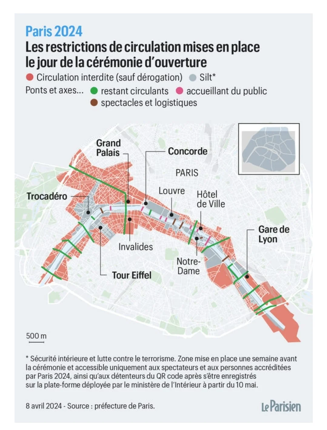 Per tutta la durata dei giochi e in forma più estesa anche nei giorni vicini alla cerimonia di inaugurazione, le zone di Parigi dove si svolgono i giochi o gli spettacoli verranno suddivise in tre zone di sicurezza con limitazioni alla circolazione progressive.