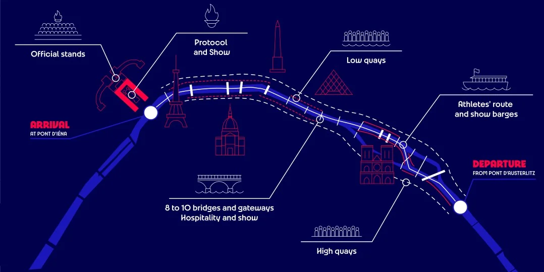 L' inizio sarà alle 19:30 dal ponte Austerlitz (ad est), poi costeggiando le due isole al centro della città, l’Île Saint Louis e l’Île de la Cité, fin sotto la torre Eiffel e Trocadéro per la parte finale della cerimonia, intorno le 23.