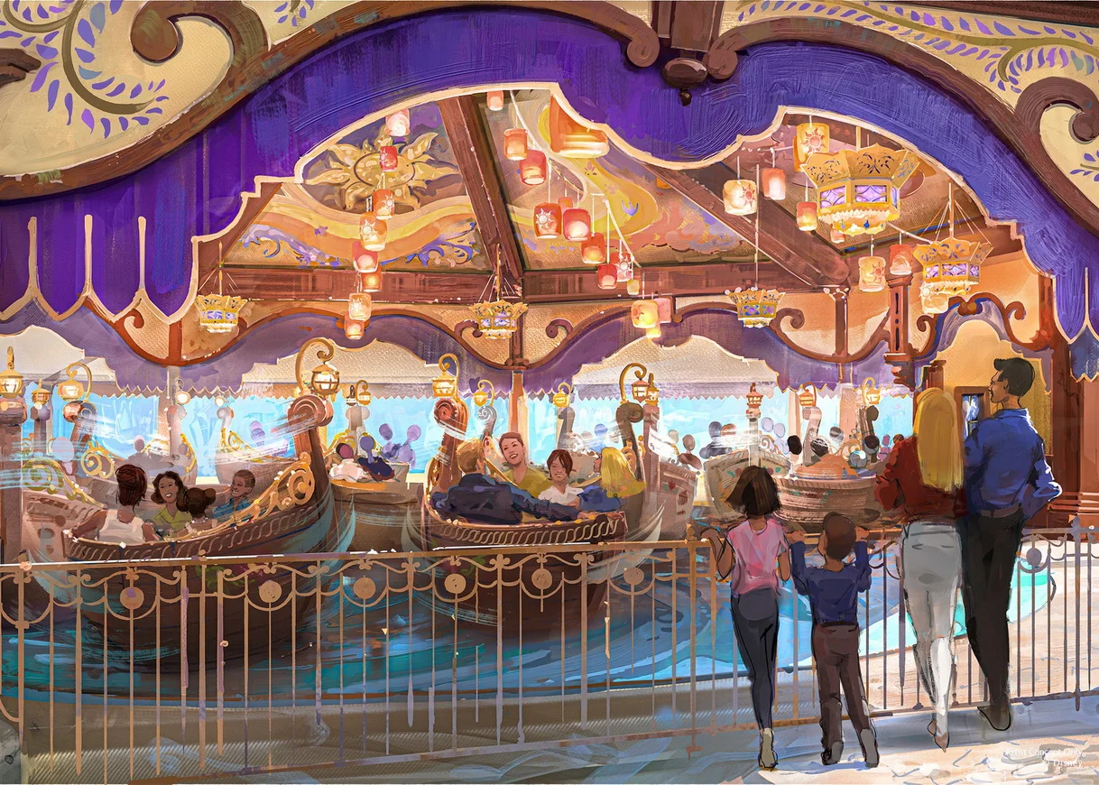 Ci si siede su delle gondole rotanti che si muovono sotto il soffitto dipinto a mano dal quale calano le lanterne che fanno rivivere la scena delle lanterne volanti di Rapunzel, mentre si ascolta una musica esclusiva e gli annunci di Mandy Moore. -2025-2026-10.webp)