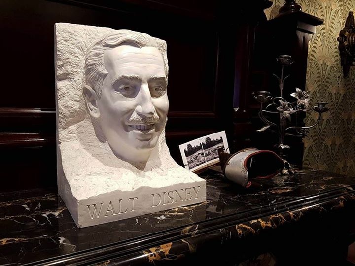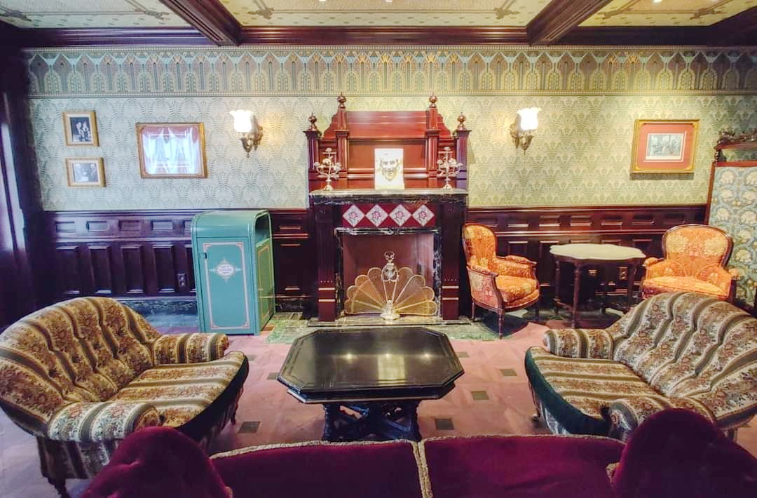 Quindi puoi accedere al piccolo ma elegante salottino, arredato in stile vittoriano, con alcune sedie e tavolini e due divanetti davanti a un camino. Lì sopra trovi un busto in gesso di Walt Disney e un antico visore di immagini tridimensionali.![]()