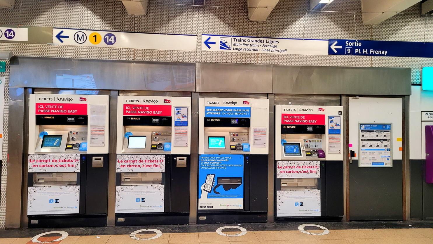 Gli sportelli automatici con una cornice vistosa viola scuro servono per ricaricare, pagando con carta di credito, un pass Navigo che già possiedi.