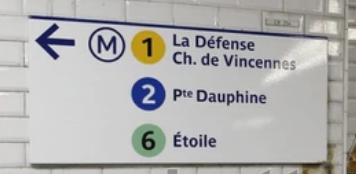 in questo cartello, se giri a sinistra vai verso la linea 1 per entrambe le direzioni, verso la linea 2 ma solo con la destinazione porte Dauphine e la linea 6 ma solo verso la destinazione Etoile.