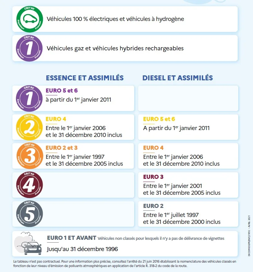 Come vedi nella tabella a fianco si va dalla categoria 0 per i veicoli elettrici alla categoria 5 per auto diesel o benzina (essence) fino a motore euro 2. Gli euro 1 non sono classificati.