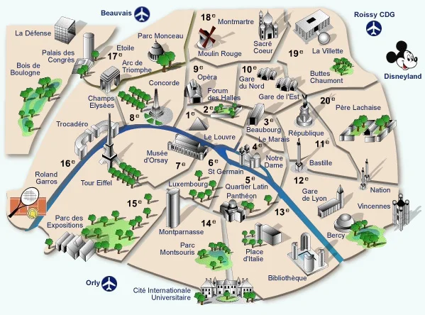 Queste cartine ti mostrano la distribuzione dei vari monumenti e punti di interesse di Parigi.